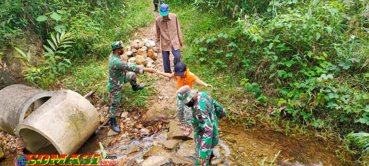 Ini bisa dilihat dari yang dilakukan Personel Satgas Pra TMMD Ke 111 Kodim 0306/50 Kota yang sedang membantu beberapa orang warga masyarakat yang didalamnya ada beberapa anak anak dalam menyeberangi anak sungai. Selasa (25/5/2021).