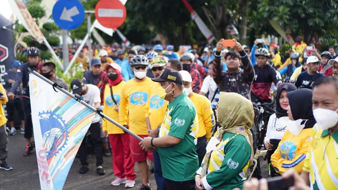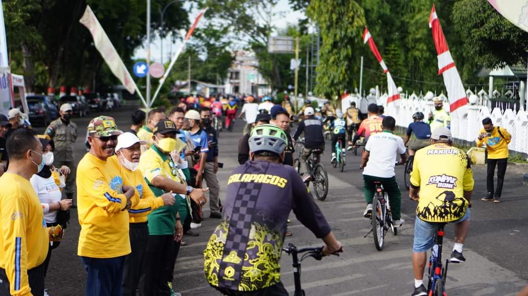 SOMASINEWS.COM BONE SULSEL, Bupati Bone DR. H. A. Fahsar M. Padjalangi, M. Si., didampingi Ketua TP PKK Bone Hj. Kurniaty A. Fahsar, SH.,Spec.Not., melepas Sepeda Santai Di depan Rumah Jabatan Bupati Bone, Jln. Petta Ponggawae, Sabtu, 19 Maret 2022.
