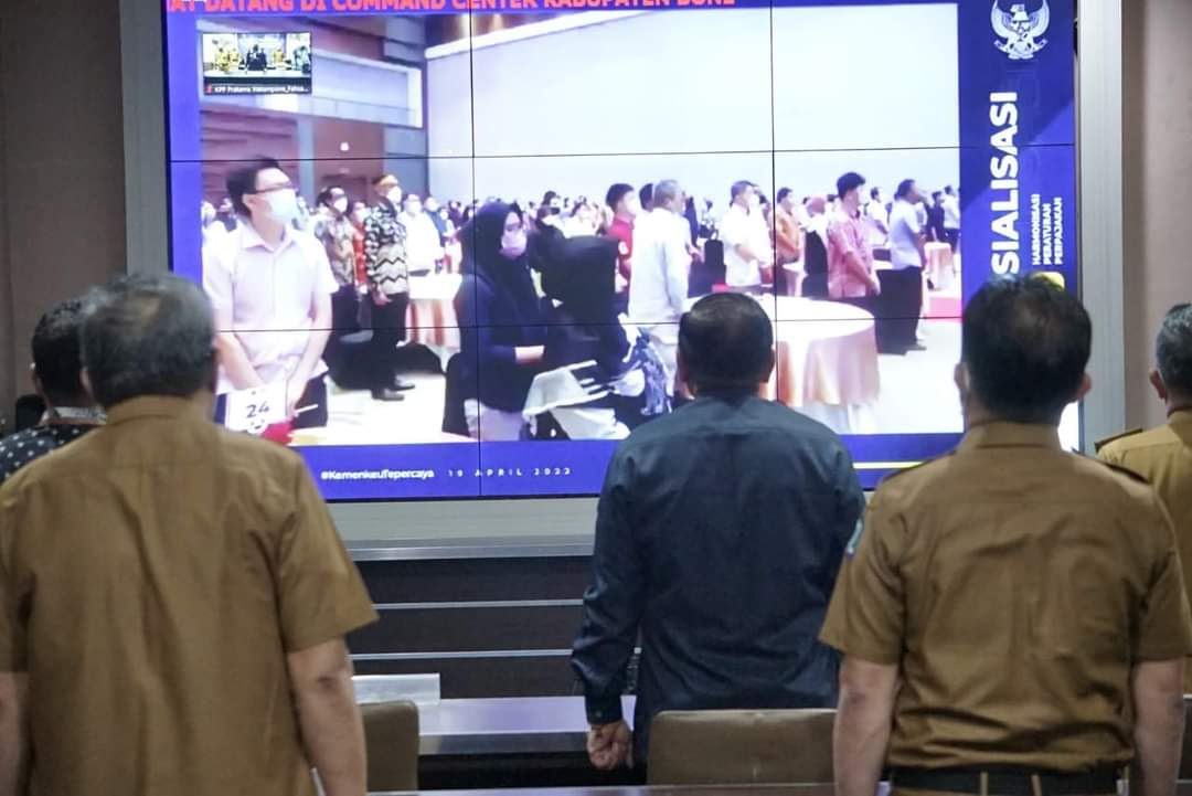 SOMASINEWS.COM BONE SULSEL, Bupati Bone DR. H. A. Fahsar M. Padajalangi, M.Si., didampingi Sekretaris Daerah Bone Drs. H. A. Islamuddin, S.H., mengikuti Sosialisasi Undang-undang Harmonisasi Peraturan Perpajakan ( UU HPP ) Secara Virtual di Command Centre Kabupaten Bone Selasa, 19 April 2022.