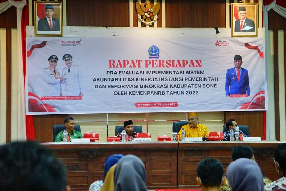 SOMASINEWS.COM BONE SULSEL, Bupati Bone DR. H. A. Fahsar M. Padjalangi, M.Si., didampingi Wakil Bupati Bone Drs. H. Ambo Dalle, M.M., membuka Rapat Persiapan Pra Evaluasi Implementasi Sistem Akuntabilitas Kinerja Instansi Pemerintah dan Reformasi Birokrasi Kabupaten Bone oleh Kemenpan RB Tahun 2022.