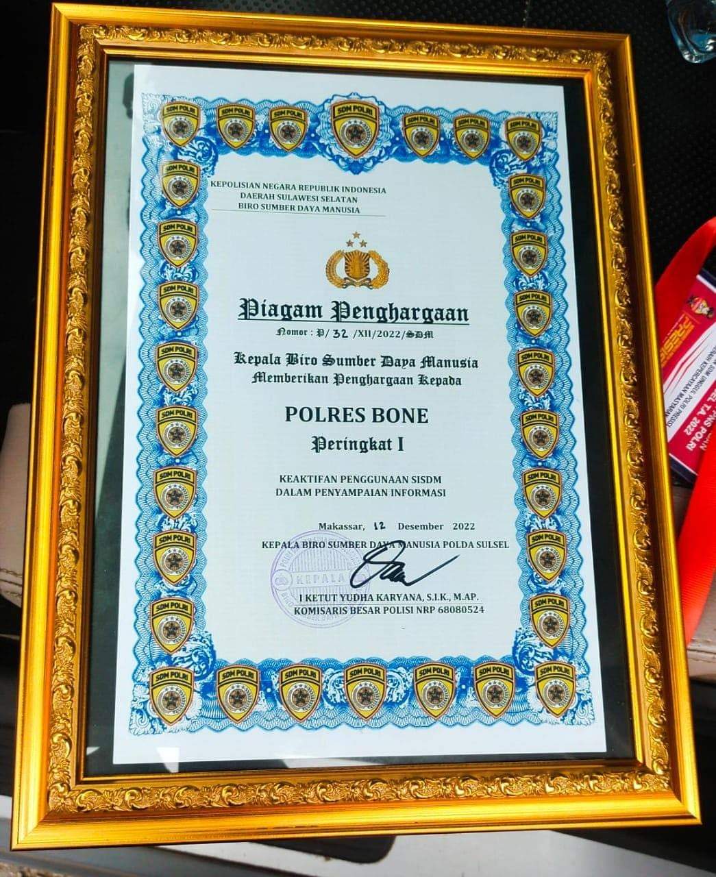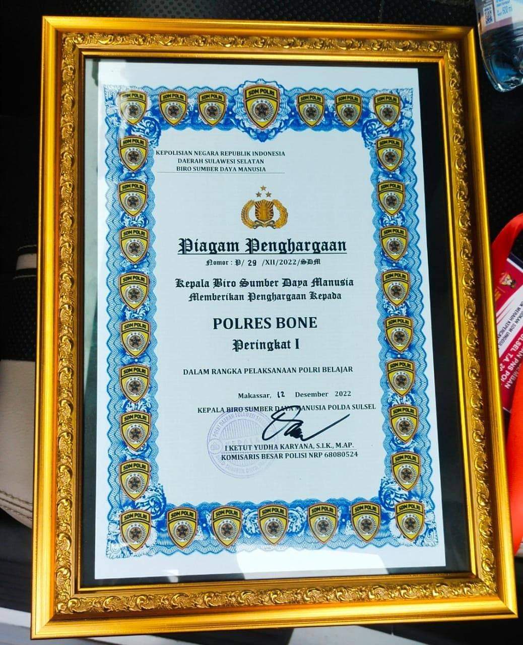 Penghargaan kali ini, Polres Bone meraih penghargaan langsung dari Polda Sulsel berupa; Peringkat Satu Polri Belajar, Peringkat Satu Penggunaan SiSDM Dalam Penyampaian Informasi, Peringkat Dua Pengiriman Tercepat Hasil Kesamaptaan Jasmani dan Beladiri Polri, dan terakhir Terbaik Tiga Pelayanan E-Mental SDM Polri.