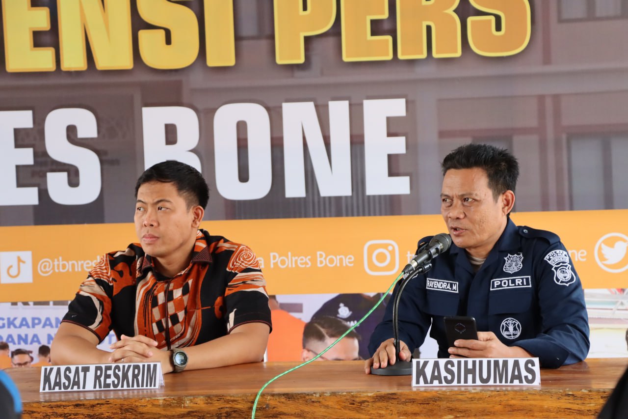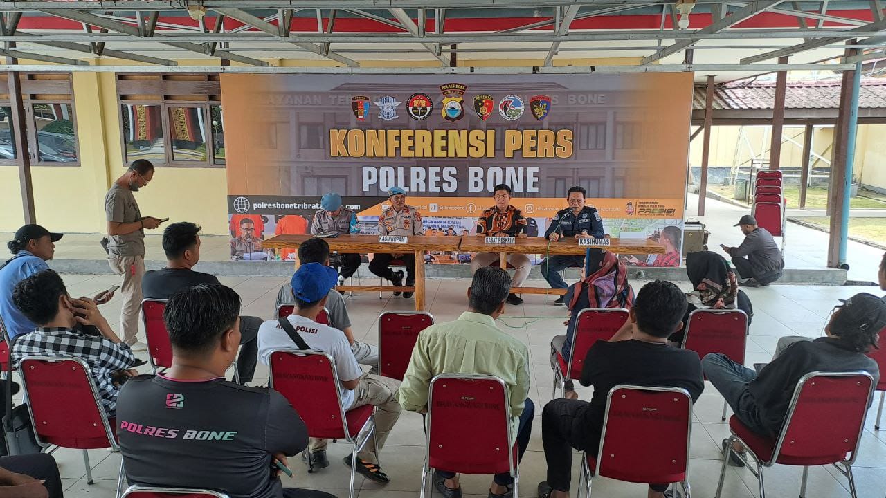 Konferensi pers dipimpin langsung oleh Kasat Reskrim AKP Bobby Rachman,S.H. dan didampingi oleh Kasipropam Iptu Akhyar bersama Kasubsi PIDM Sihumas Iptu Rayendra Muchtar,S.H. di Aula Terbuka Mapolres Bone.