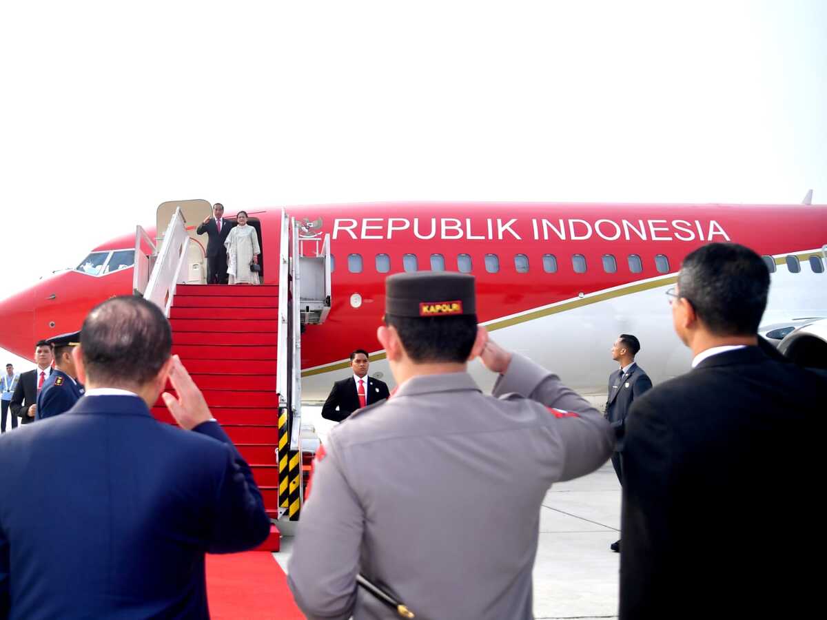 Usai menempuh penerbangan selama sekitar 5 jam, Pesawat Kepresidenan Indonesia-1 yang membawa Presiden dan Ibu Iriana mendarat sekitar pukul 14.40 waktu setempat. Setelah pesawat berhenti sempurna, kemudian Presiden dan Ibu Iriana turun melewati tangga pesawat dan terlihat dua orang anak memberikan bunga tangan kepada Presiden dan Ibu Iriana.