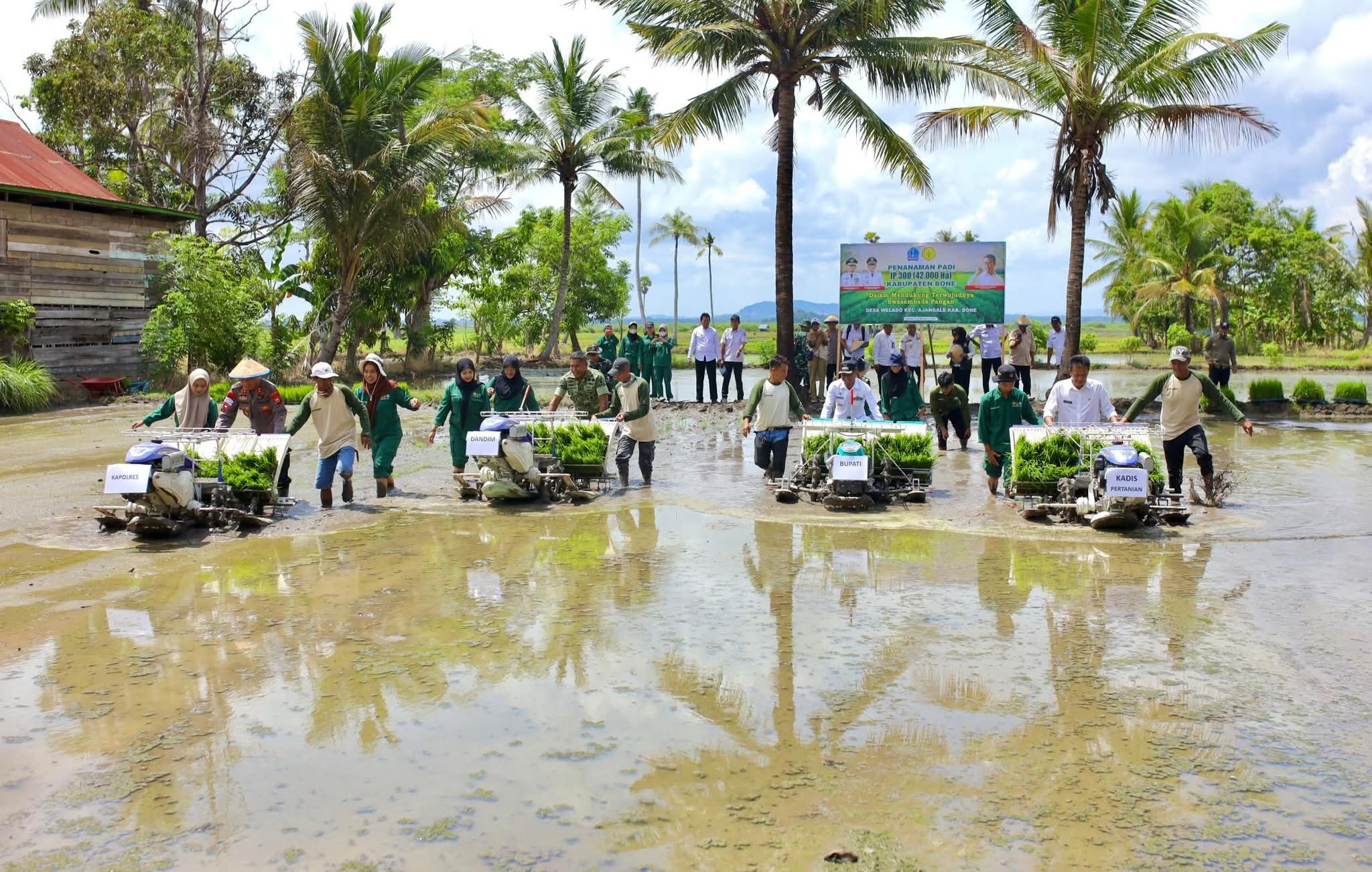 Bupati Bone bersama Kadis Pertanian, Dandim dan Kapolres juga terlihat mengoperasikan mesin transplanter atau alat penanaman padi sebagai simbol dimulainya penanaman modern berbasis mekanisasi.