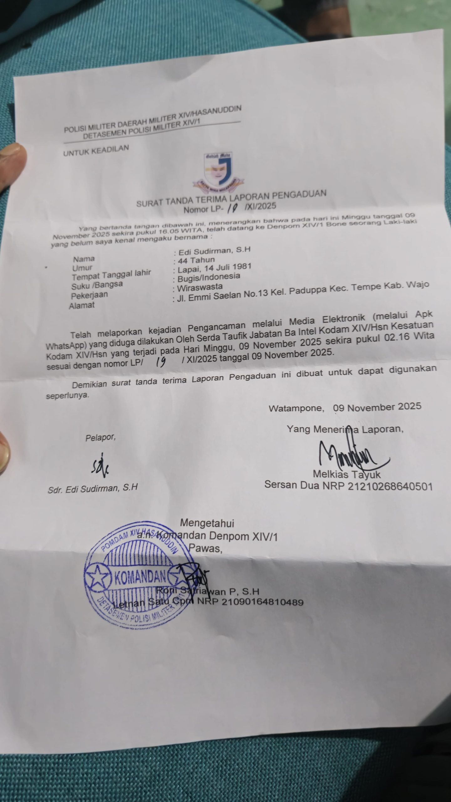 ”Atas kejadian ini, saya sudah resmi melaporkan oknum tersebut ke Detasemen Polisi Militer (Denpom) Bone,” tutup Edy, berharap laporannya segera diproses tuntas dan oknum tersebut mendapatkan sanksi tegas.