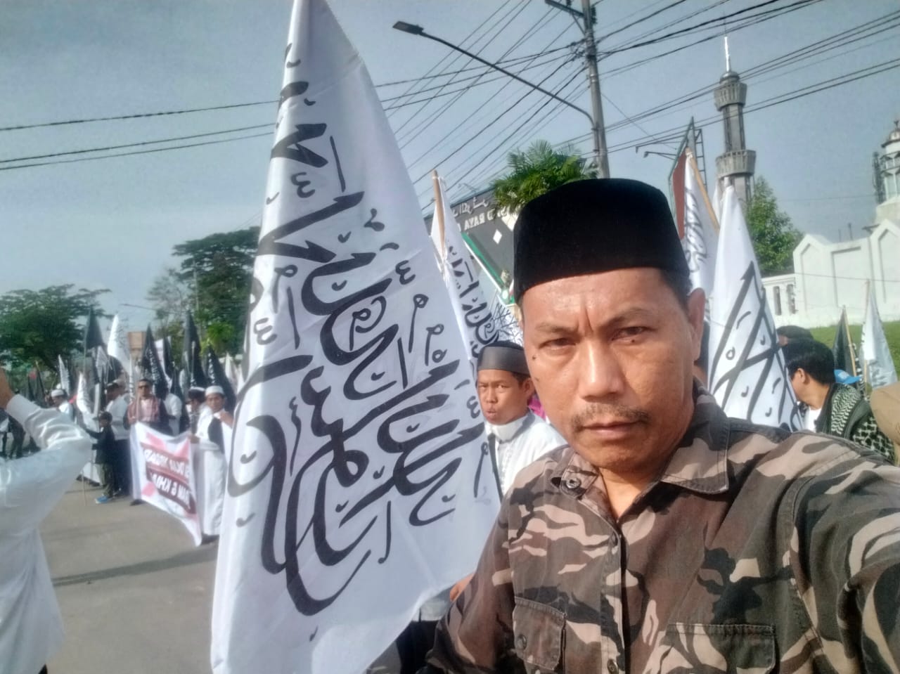 Ribuan peserta membentang spanduk dan poster dukungan terhadap Palestina, serta mengibarkan ratusan bendera Al Liwa dan Ar Roya (panji Rasulullah) sebagai simbol bendera persatuan Umat Islam.
