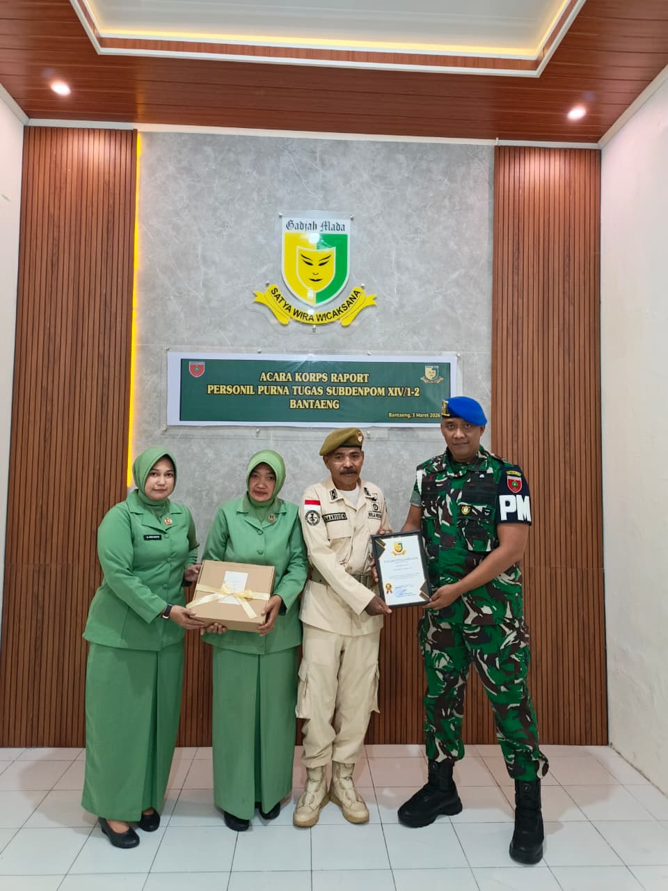 Acara pelepasan Korp Raport Personel Purna Tugas dilaksanakan diaula Masubdenpom XIV/1-2 Bantaeng dalam keadaan khidmat. Kegiatan ini dihadiri Para Personel Bintara, Tamtama dan Ketua Persit KCK Anak Ranting 2) Subdenpom XIV/1-2 Btg beserta Pengurus Persit.